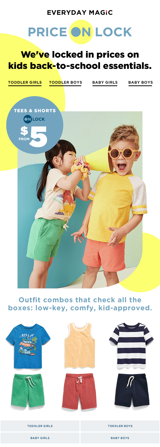 ▪️Message Intent: Change to mix and match, leverage from consideration. Breadth & range of Summer Shorts, Leggings & Tees for kids to wear this summer.