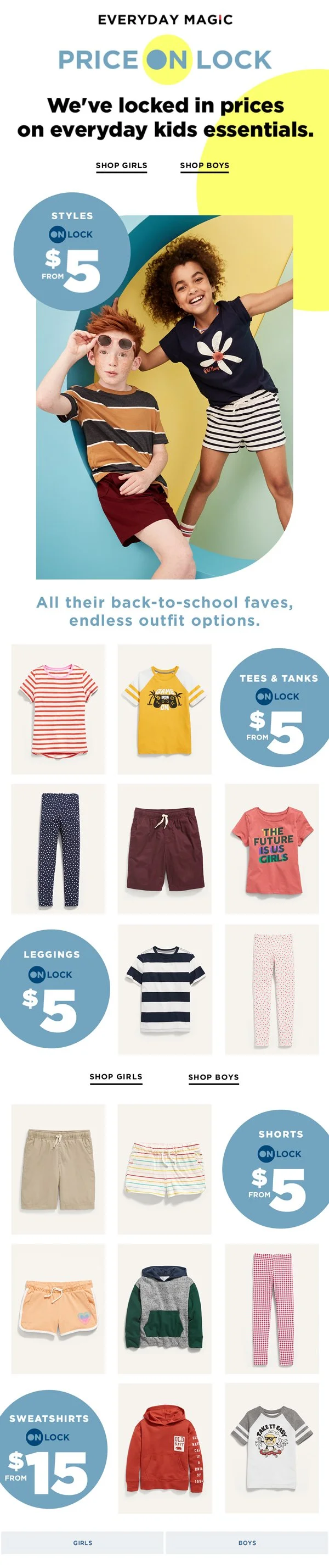 Message Intent: Stock up moment on summer basics for Girls & Boys (Tees, tanks, shorts, dresses, activewear).